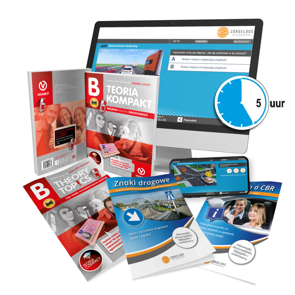 In dit alles in een auto theorie pakket in het Pools ontvang jij een groot aantal producten. Zo ontvang je een auto theorieboek, een auto theorie samenvatting en 5 uur examens oefenen in het Pools. Daarnaast ontvang je ook nog eens twee aanvullende boekjes. Het eerste boekje bevat informatie over het CBR, en het tweede boekje bevat alle verkeersborden met een uitgebreide toelichting. Kortom, alles wat je nodig hebt om te leren voor je CBR auto theorie examen in het Pools!